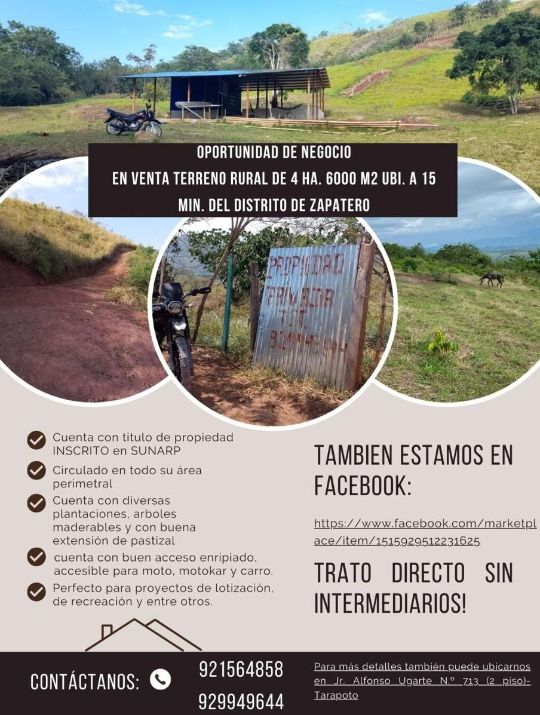 Gran oportunidad de negocio. Se vende terreno rural de 4 hectáreas y 6,000 m², ubicado a solo 15 minutos del distrito de Zapatero, con acceso directo y título inscrito en SUNARP.