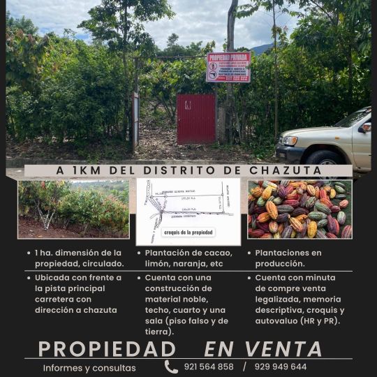 Excelente oportunidad de inversión. Se vende propiedad de 1 hectárea ubicada a solo 1 km del distrito de Chazuta, con frente directo a la carretera principal.